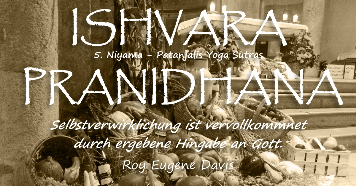 Ishvara Pranidhana bedeutet Hingabe an Gott; bereitwillige Hingabe des illusorischen Gefühls einer Selbstheit zugunsten eines Erwachens zu Bewusstsein und Erkenntnis transzendenter Realitäten.