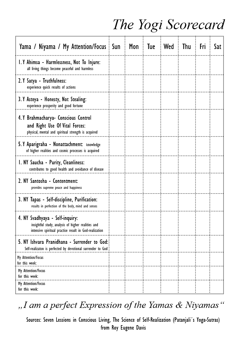 - Stay positive, don’t punish yourself or feel bad if you reacted not as constructive as you would like to. - After one week continue with the next Yama/Niyama and change it every week. After 10 weeks start again from the beginning.